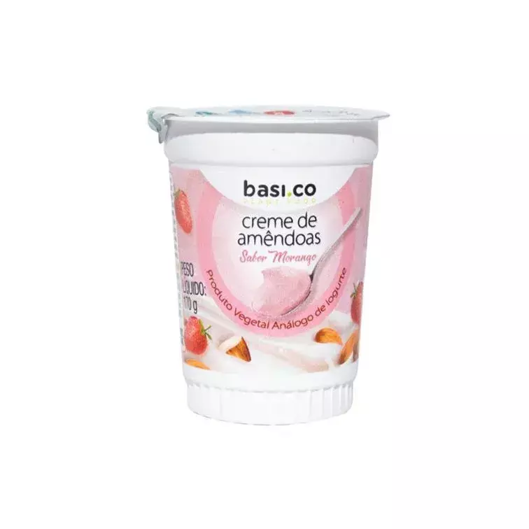 Leite de amêndoas (água e amêndoas), preparado de morango (açúcar líquido invertido, água, polpa de morango, amido modificado, aroma idêntico ao natural de morango, corantes azorrubina, acidulante ácido cítrico, sorbato de potássio), açúcar, amido modificado, ácido lático (obtido por fermentação de cana de açúcar), goma xantanam fosfato tricálcico, conservador sorbato de potássio e fermento.