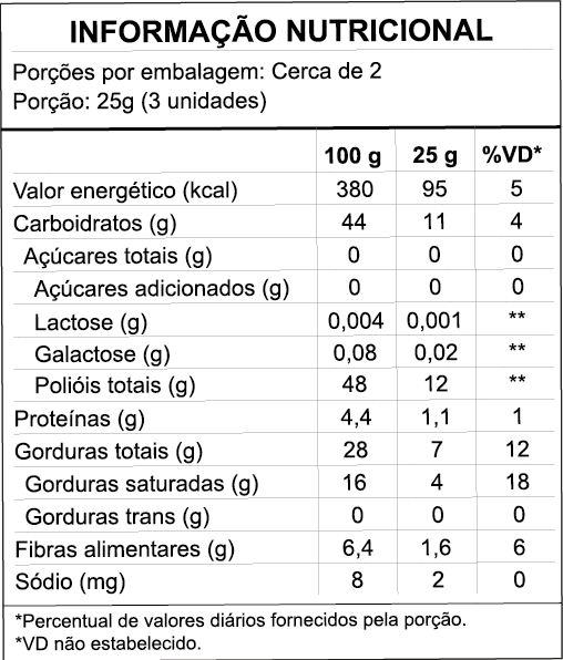 INGREDIENTES: Chocolate branco zero, para dietas com restrições de lactose e ingestão controlada de açúcar (manteiga de cacau, leite de coco em pó* sal, edulcorantes: malitol e eritrirol, emulsificantes: lectina e esteres de ácido rinocinoléico interesterificados com poliglicerol e eromatizantes idênticos ao natural), crispies de quinoa.