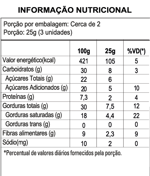 INGREDIENTES: Chocolate amargo 70% cacau, (açúcar, massa de cacau, manteiga de cacau, emulsificantes: lectina e aromatizantes idênticos ao natural), crispies de quinoa.