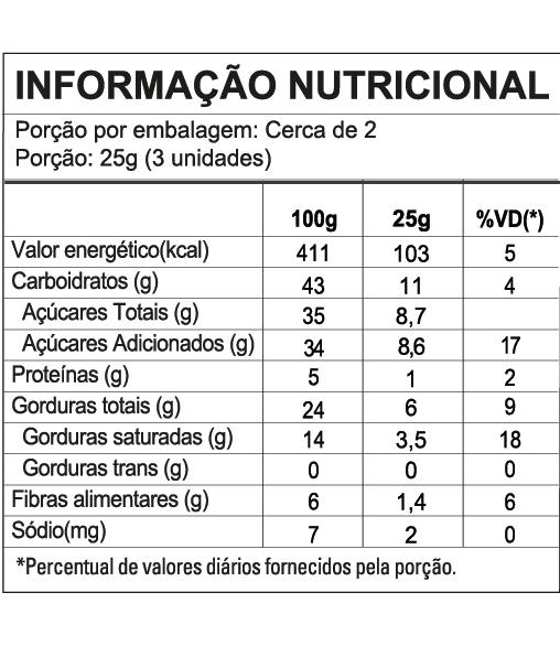 INGREDIENTES: Chocolate meio amargo 50% cacau (açúcar, massa de cacau, manteiga de cacau, emulsificantes leticina de soja e ésteres de ácido ricinoléico interesterificado com poliglicerol, aroma idêntico ao natural), crispies de quinoa.